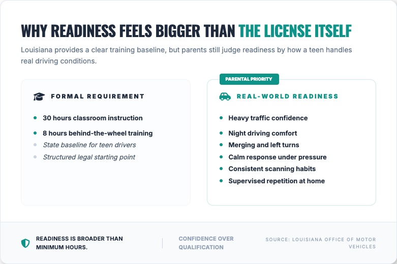 In Louisiana, the formal path to teen driving is clearly structured. According to the Louisiana Office of Motor Vehicles student and parent information page, teens ages 15 to 17 complete a 38-hour driver education course that includes 30 hours of classroom instruction and 8 hours behind the wheel. That framework matters because it gives families a legal and instructional baseline. Still, parents often understand instinctively that minimum hours do not answer every question they have about real-world readiness. A teen may complete the required instruction and still need more practice in heavy traffic, neighborhood scanning, merging, nighttime driving, or managing anxiety behind the wheel.