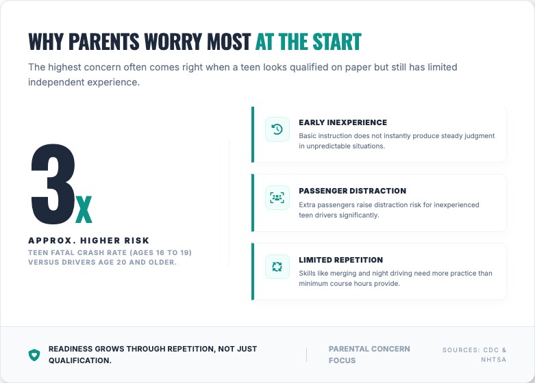 What often sharpens concern is the timing. Risk is not spread evenly across the teen driving years. It is concentrated in the earliest period, when a teen has basic instruction but limited independent experience. Parents tend to feel that intuitively. They know their child may understand rules in theory while still needing more repetition before reactions become steady and judgment becomes more reliable. That is why so many parents worry most at the exact moment their teen begins to seem qualified on paper.